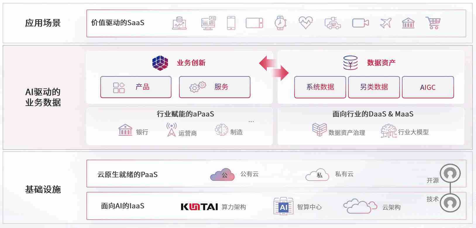 数字时代,,,围绕企业数字化转型的关键要素,,,NG娱乐数码开创性的提出数云融合战略和技术体系框架,,,着力在云原生、、数字原生、、、、AI原生和信创产业上架构产品和服务能力,,为处在不同数字化转型阶段的快消零售、、汽车、、金融、、、、医疗、、政企、、教育、、、运营商等行业客户提供泛在的敏捷IT能力和融合的数据驱动能力,,构建跨界融合创新的数字业务场景和新业务模式,,,助力企业级客户建立面向未来的核心能力和竞争优势,,全面推动社会的数字化、、、智能化转型升级。。。。