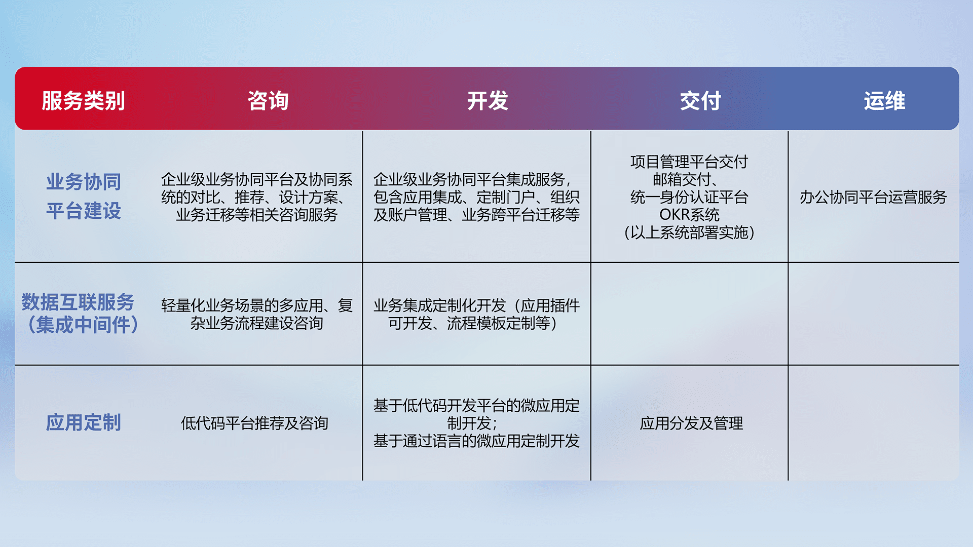 针对钉钉、、、企微、、IDaas等平台级产品提供产品的规划、、、、方案、、交付、、、、定制化开发等服务,,实现如统一协同办公、、、、智能客户服务、、、混合会议管理、、、、智能数据查询、、、等业务场景,,,,实现数字化转型。。。
